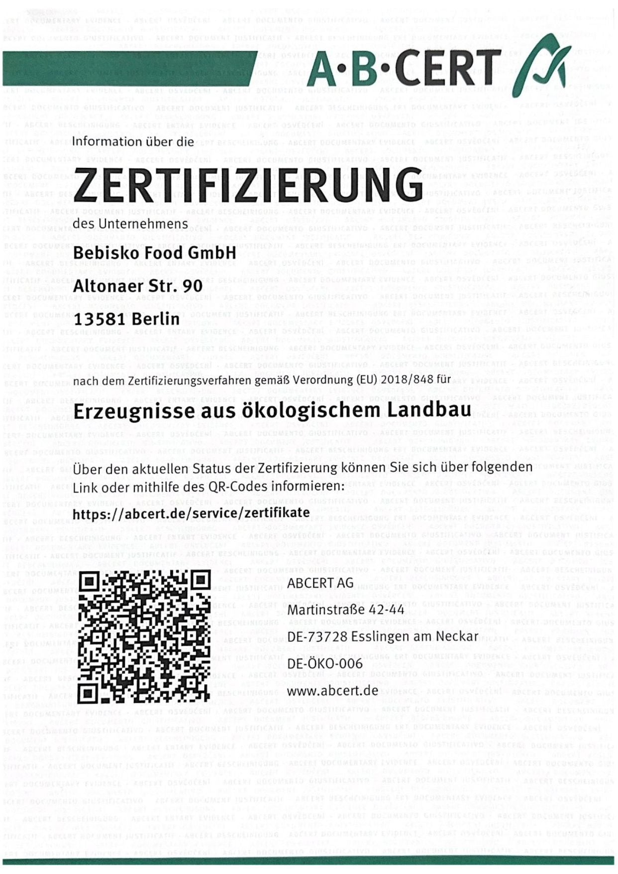 Wir wurden im Rahmen der Kontrolle auf die ökologische Wirtschaftsweise geprüft und haben alle Anforderungen der EU-BIO-VO erfüllt. Daher sind wir von der Kontrollstelle ABCERT AG für unsere Bio-Produkte zertifiziert - was uns sehr Stolz macht, da wir behutsam bei der Wahl unserer qualitativen Zutaten vorgehen und alle Prozessschritte im Detail verfolgen.